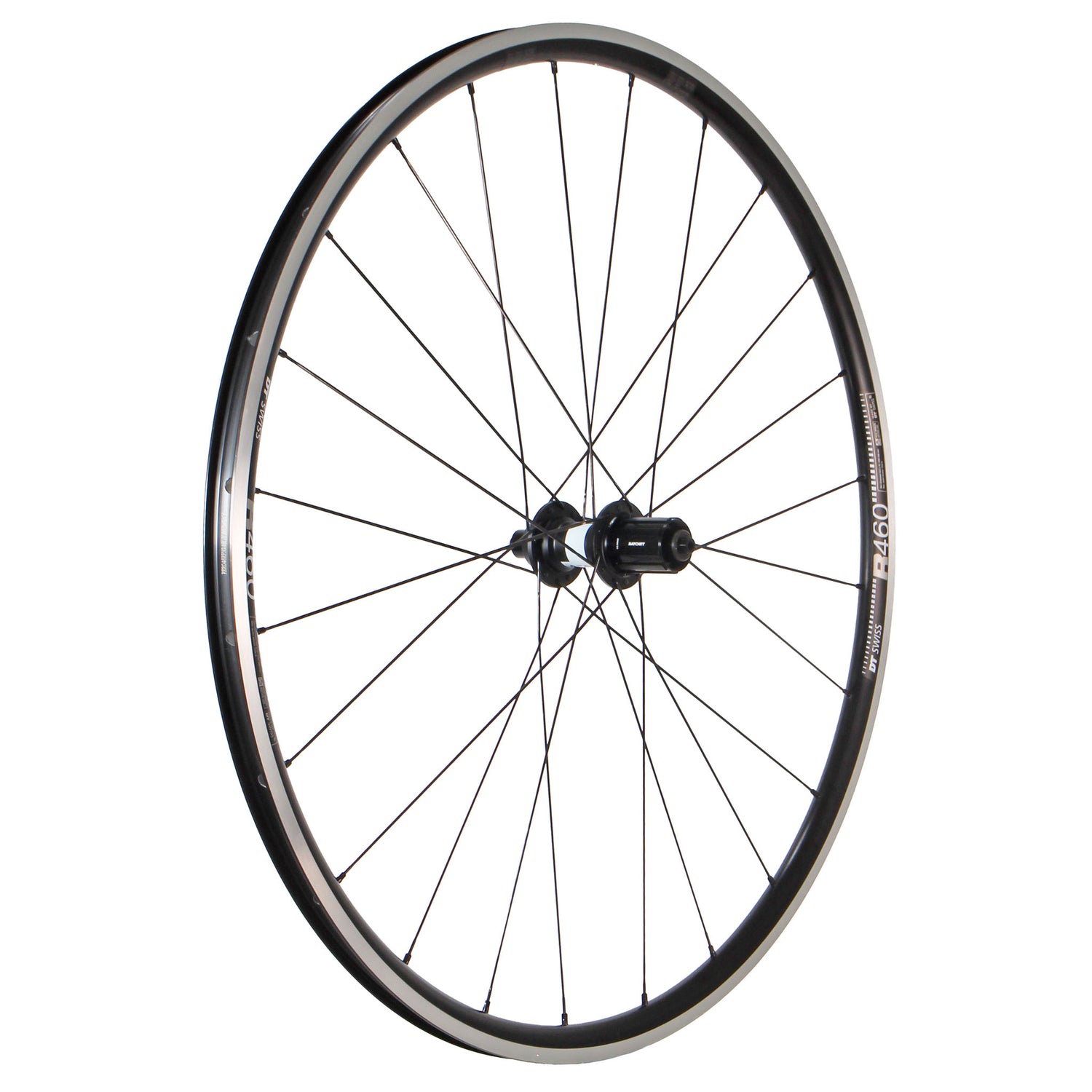 - Wheel Factory hand built wheels\n- DT Swiss R460 rim is tubeless compatible with a sleeved joint, 18mm ID, 23mm OD width\n- DT Swiss 350 hubs, steel bearings, non-disc\n- Inc 36t ratchet that can be easily upgraded to the 54t high engagement option\n- Built with Sapim CX-Ray spokes and alloy DT Swiss Squorx nipples\n- QR skewers NOT included\n- Hand laced and trued in the USA