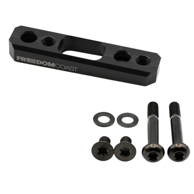 - Precision machined 6061 aluminum for tighter tolerances than stock cast adapters, minimizing pad/rotor alignment issues and pad rubbing\n- Weight optimized adapter and bolts save 9.3g over stock adapter setup\n- Reversible design to allow for either a 20mm increase or decrease in rotor size depending on the orientation of mounting\n- Kit includes (1) adapter, (4) black titanium bolts\n- Made in USA
