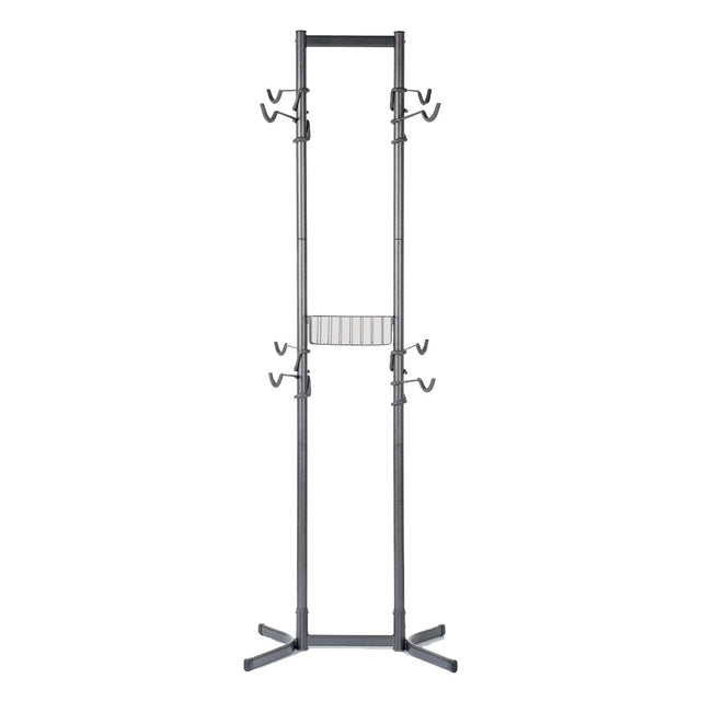 - Safely suspends your bicycles and securely holds them within reach for your next ride\n- No permanent drilling or hanging required\n- Rubber coated arms protect bike finish and rubber feet keep the rack in place\n- Features a basket to store your bike accessories as well\n- 4 bike capacity