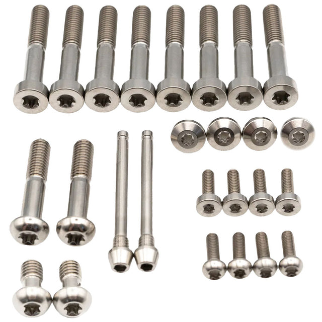 - 6AL-4V grade 5 aerospace titanium bolt kit for SRAM Maven brakes (front and rear)\n- Includes (2) SRAM brake lever clamp bolts, (1) Maven lever bleed port kit, (2) Maven pad retention bolts, (8) Maven caliper body bolts, (2) Maven caliper banjo bolts (SLV/ULT only, BRZ doesn't have banjo bolts)\n- Due to variations in rotor size caliper mounting hardware is not included