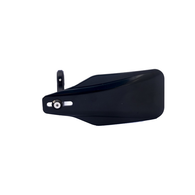 - Handguards to protect hands and handlebar control units, with pronounced curvature to give more clearance on all brake levers\n- Aluminum bracket for rigidity\n- Hinged clamp for quick and easy install removal\n- Only uses 12mm of handlebar space\n- Mounts out-board or in-board of brake lever\n- Does not interfere with shifter or dropper lever\n- Slotted shield attachment for maximum adjustability\n- Tuned flexibility in shield to flex on impact \n- Sold as a pair