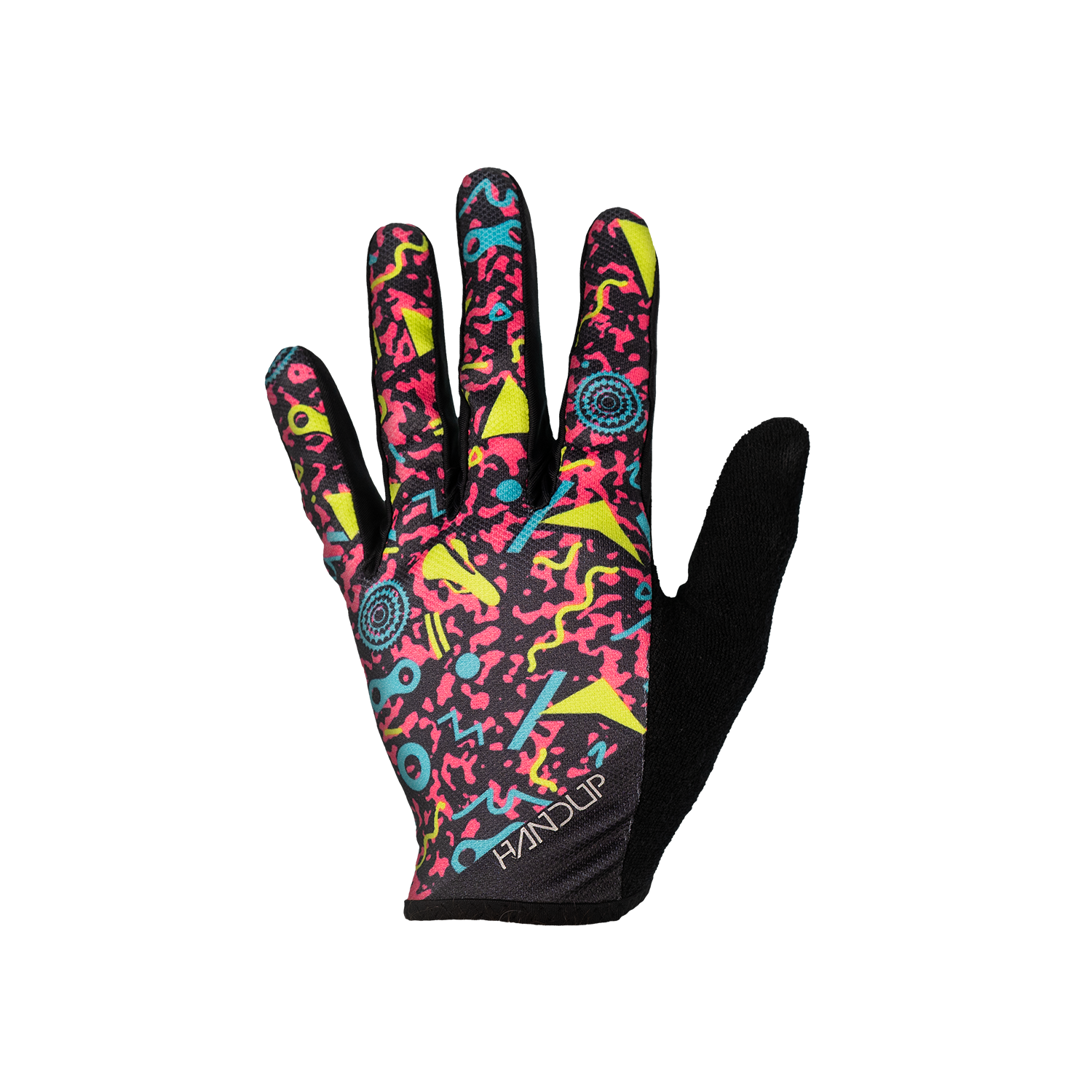 Straight from the roller rink to the trail, these are a full-send throwback to the bright, geometric chaos of ’90s roller rink carpets. Neon colors, wild shapes, and vibes you could feel through your socks, if you ever skated under blacklights while bad pop music blasted, these gloves are for you!