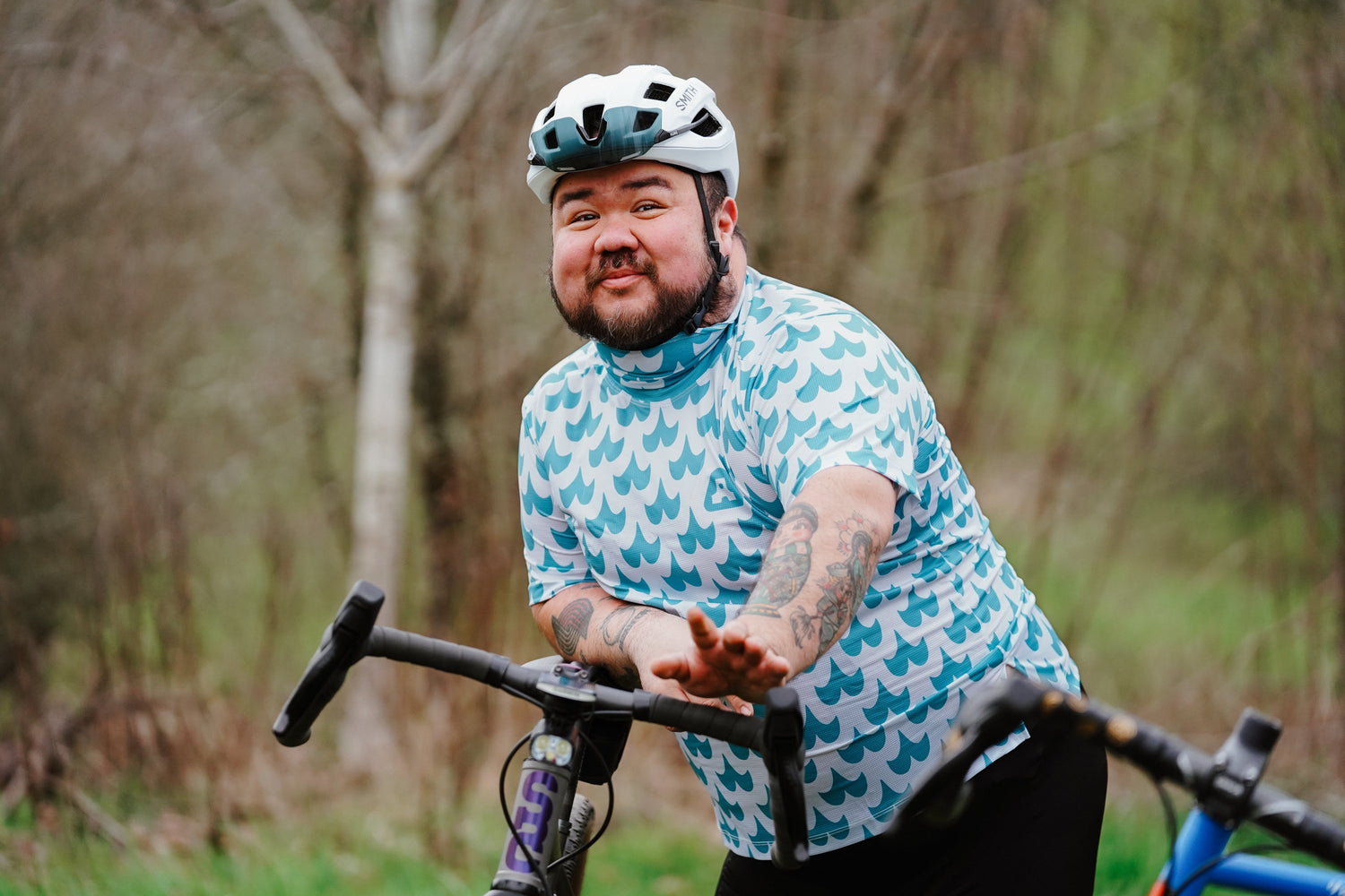Nessy is wearing the women's version of The Mustache which has slightly shorter sleeves and torso.