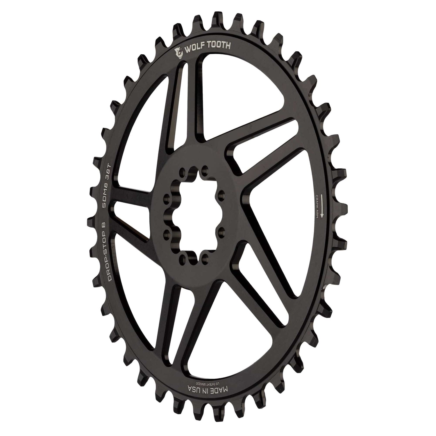 Wolf Tooth Direct Mount Chainrings for SRAM 8-bolt Cranks replace your existing spider and chainring with one clean looking, lightweight, and stiff piece of machined billet. They feature our patented Drop-Stop® design for the best wear life, chain retention, and mud clearance. Drop-Stop B is optimized for SRAM Eagle and Flattop chains.