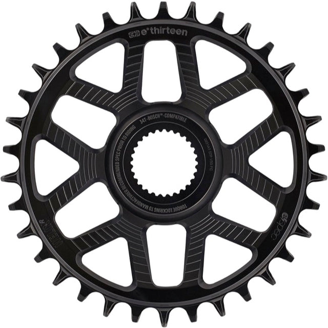 - Direct Mount chainring for a variety of E-Bike fitment\n- Updated M3 narrow-wide tooth profile eliminates chain noise, and decreases overall system wear while retaining chain\n- An alloy outer dust cover helps to prevent contamination\n- 11/12 speed. Compatible with both Shimano and SRAM 12 speed drivetrains\n- 53mm chainline to support dropping a chinring size to take advantage of e*thirteen 9t cassette cog