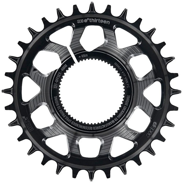 - Direct Mount chainring for a variety of E-Bike fitment\n- Updated M3 narrow-wide tooth profile eliminates chain noise, and decreases overall system wear while retaining chain\n- An alloy outer dust cover helps to prevent contamination\n- 11/12 speed. Compatible with both Shimano and SRAM 12 speed drivetrains\n- 53mm chainline to support dropping a chinring size to take advantage of e*thirteen 9t cassette cog