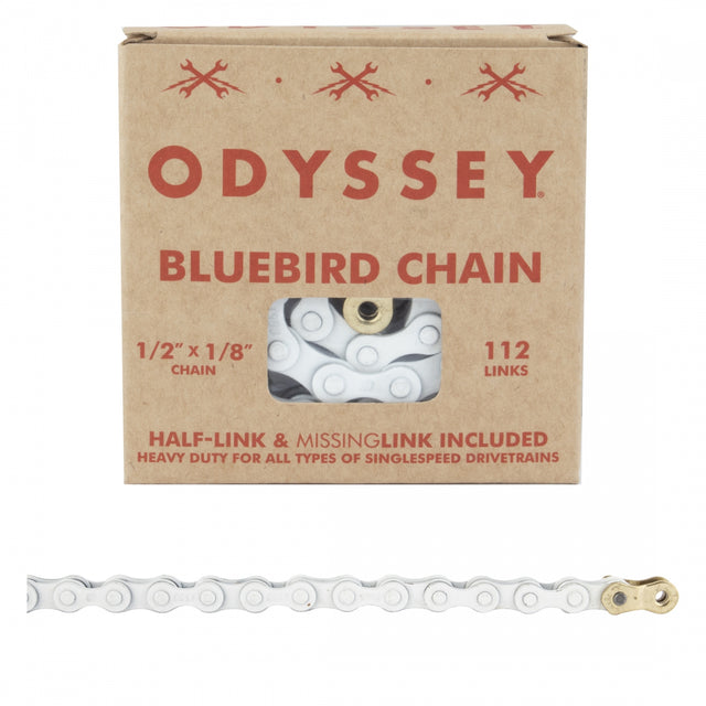 The Odyssey Bluebird chain is an Industrial Strength, 112 link 1/2 x 1/8` chain with Odyssey logos stamped on the links. The Bluebird also comes with a half link and a master link included for customization
