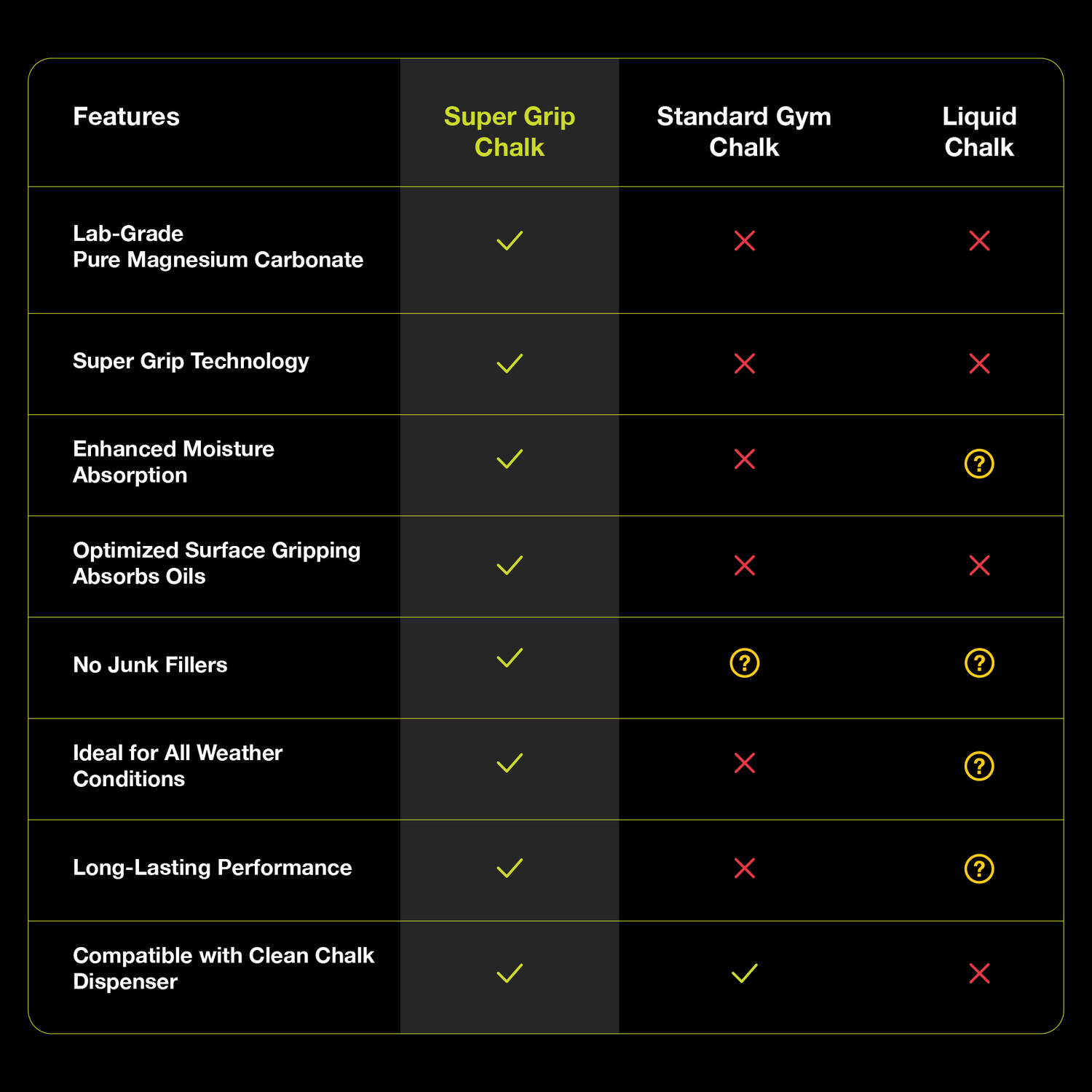 - Pro Tip: For an ultra-clean chalking experience, use Super Grip Chalk with the Clean Chalk Dispenser. It's a perfect pair - maximum grip, zero mess.