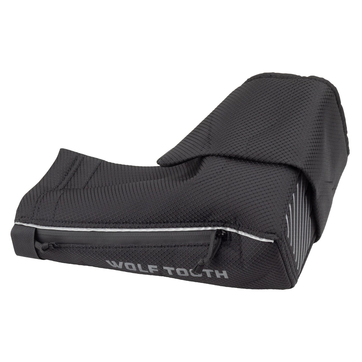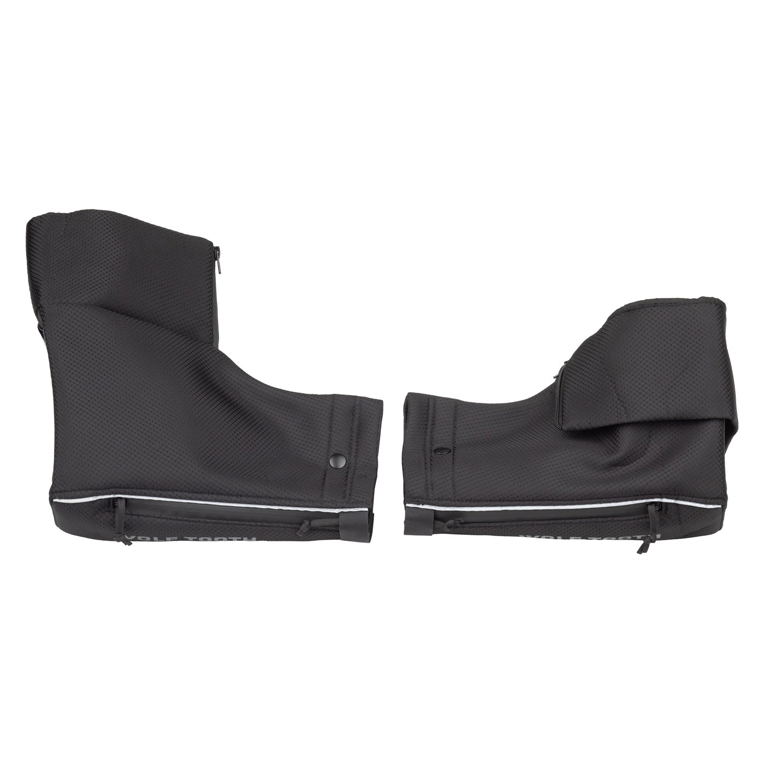Wolf Tooth Pogies provide warmth and comfort while riding in cold temperatures. They attach to mountain bike handlebar ends and cover brakes and shifters, shielding hands from wind, rain, and snow. Updates have been made from the previous version for increased warmth, more internal space, and additional adjustability.