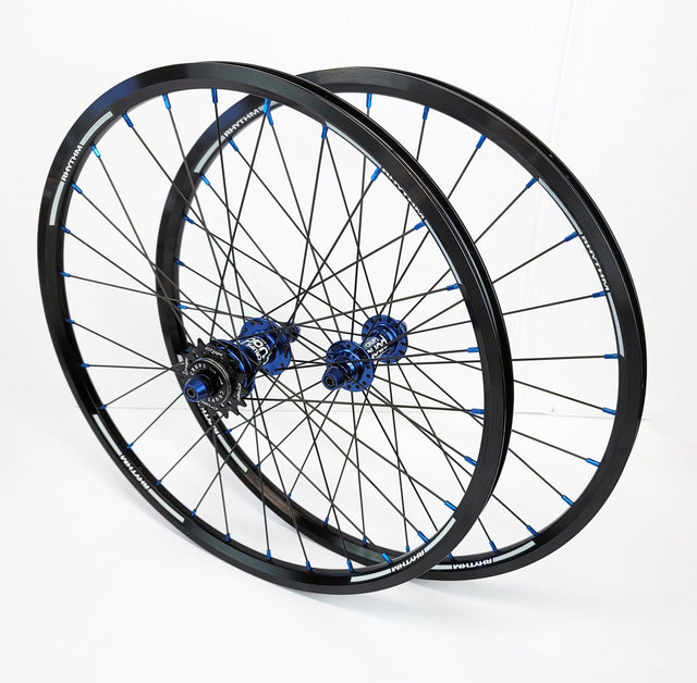 We provide 4 cog spacers which allow you to position the cog where it provides the best possible chain alignment.  Hubset comes with a 16t cog but is designed to work with any Shimano compatible cog.  Laced with 15G spokes and alloy nipples to 28H Rhythm Section rims.  Includes 16T aluminum cog and rim tape.