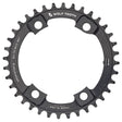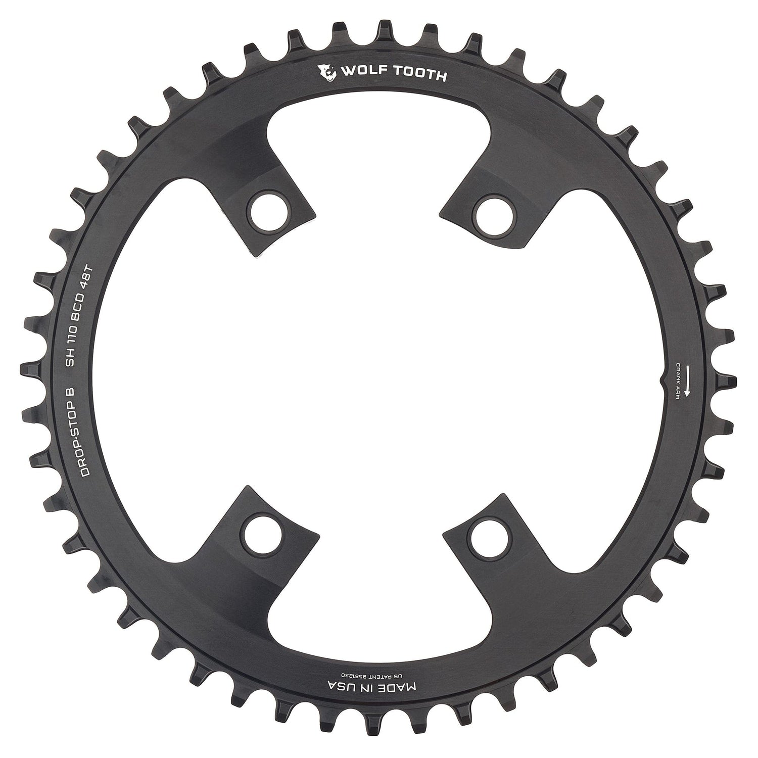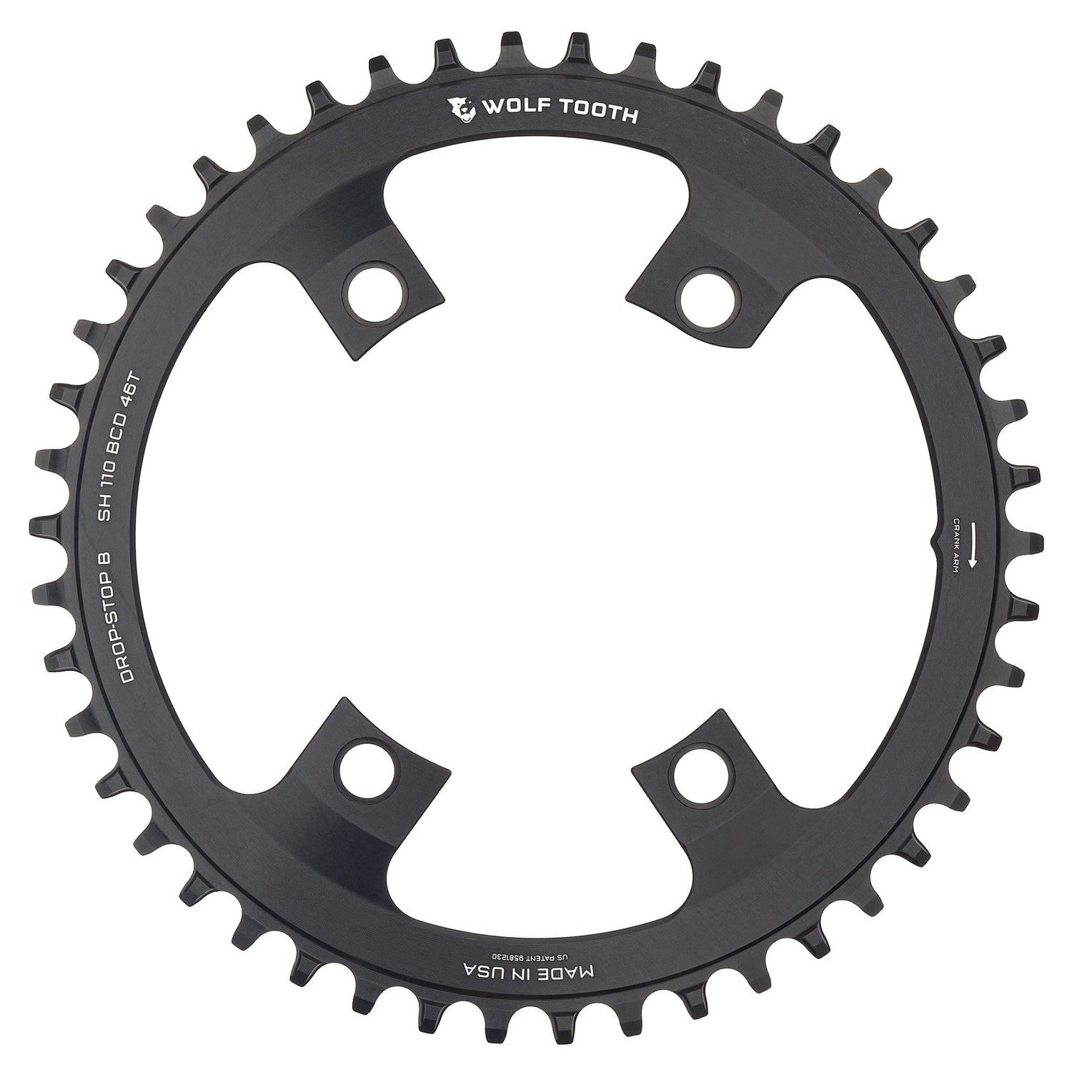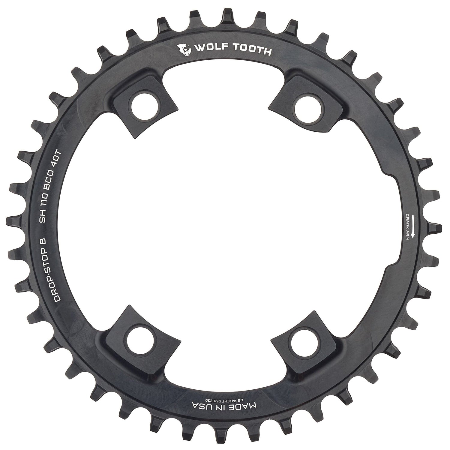 Drop-Stop technology. On Wolf Tooth’s patented wide/narrow chainring, the wide side of the tooth has maximum contact on the drive side which spreads the load and improves chainring life. The narrow side allows clearance for mud and debris which reduces friction.