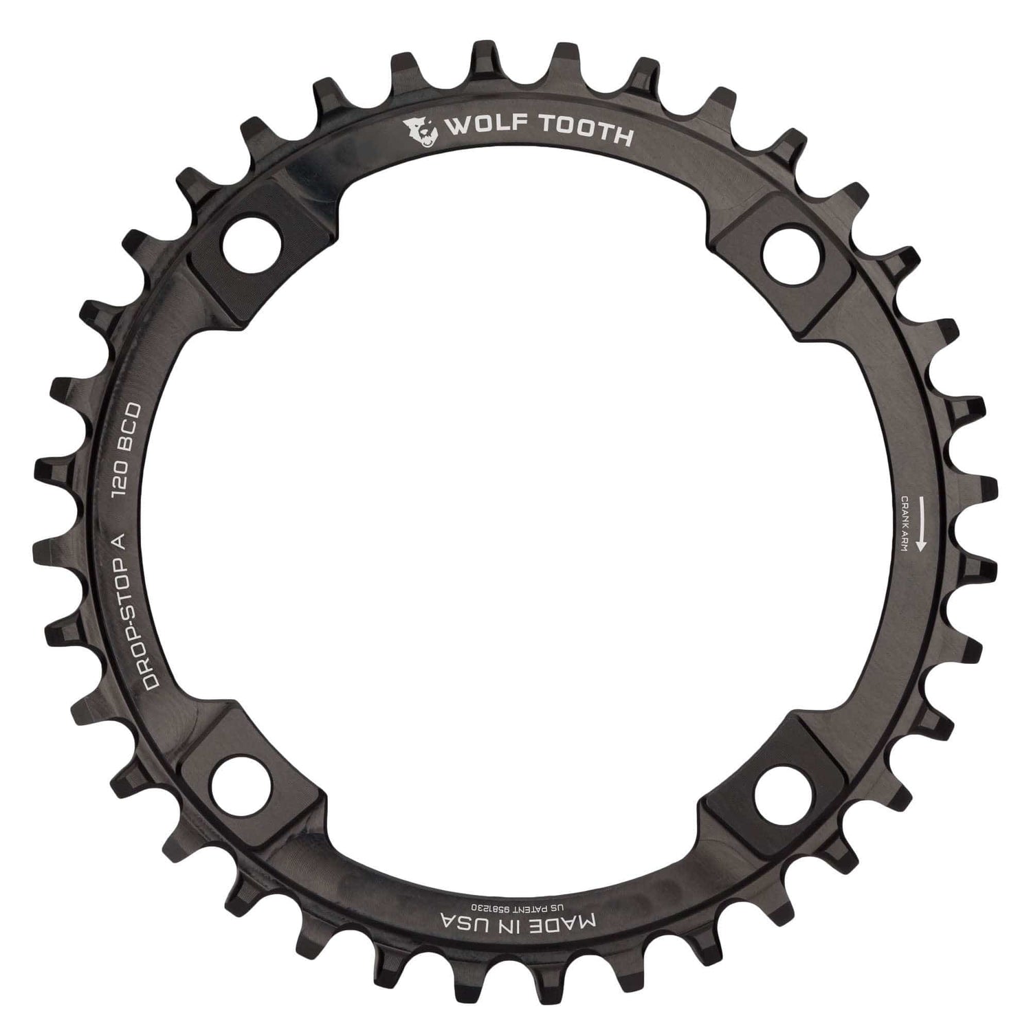 Drop-Stop technology. On Wolf Tooth’s patented wide/narrow chainring, the wide side of the tooth has maximum contact on the drive side which spreads the load and improves chainring life. The narrow side allows clearance for mud and debris which reduces friction.