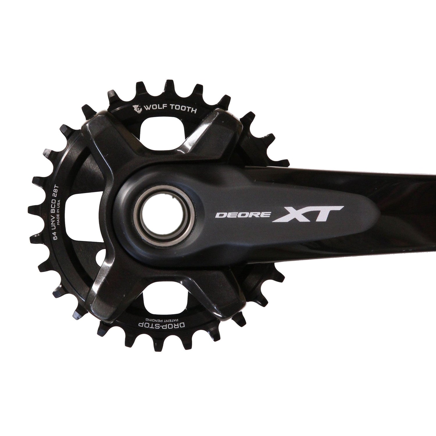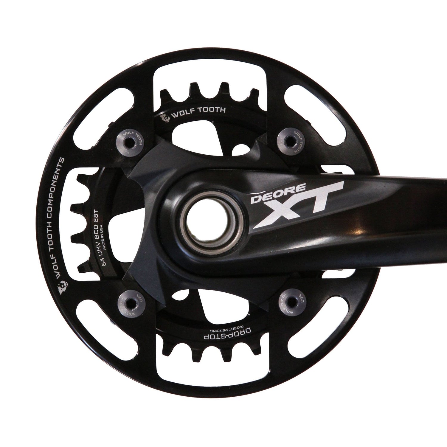 Drop-Stop® technology. On Wolf Tooth’s patented wide/narrow chainring, the wide side of the tooth has maximum contact on the drive side which spreads the load and improves chainring life. The narrow side allows clearance for mud and debris which reduces friction.