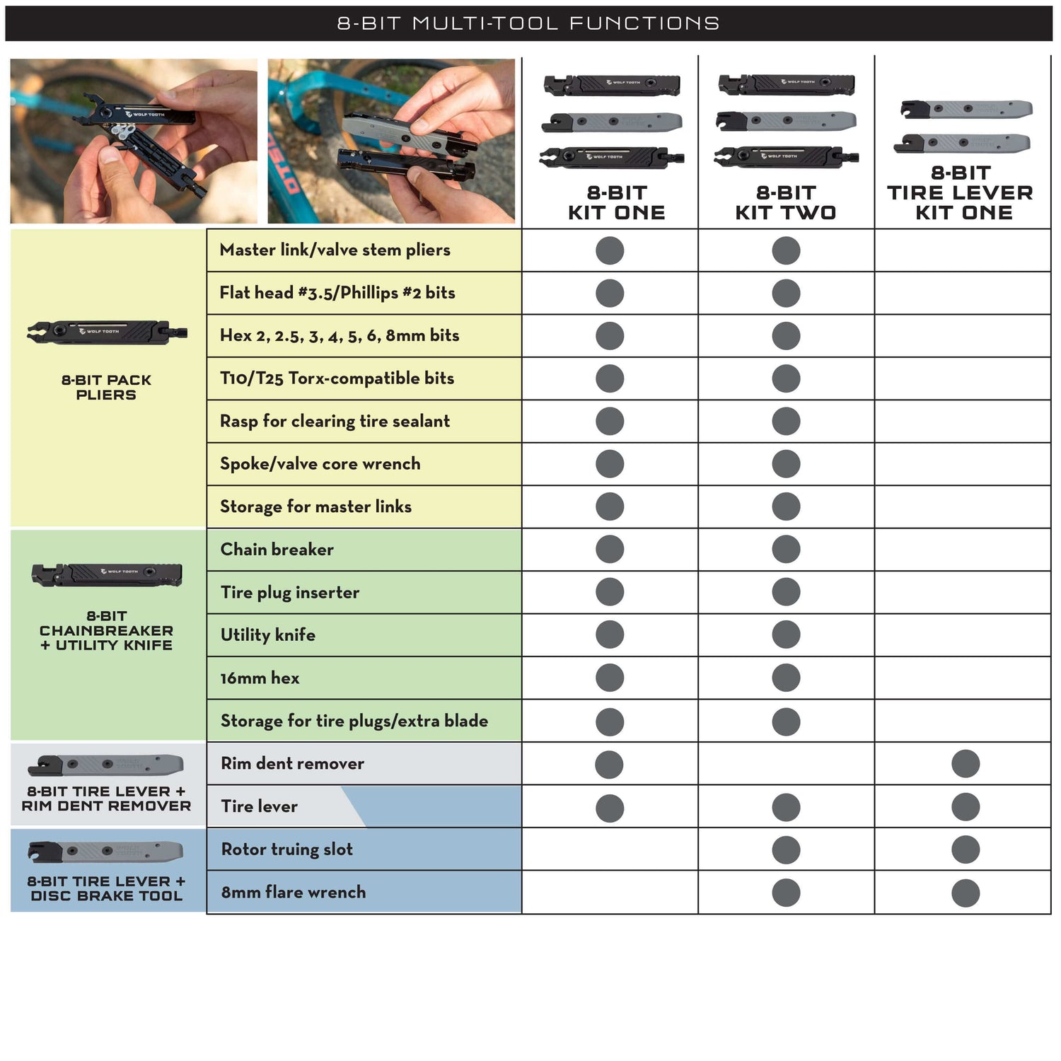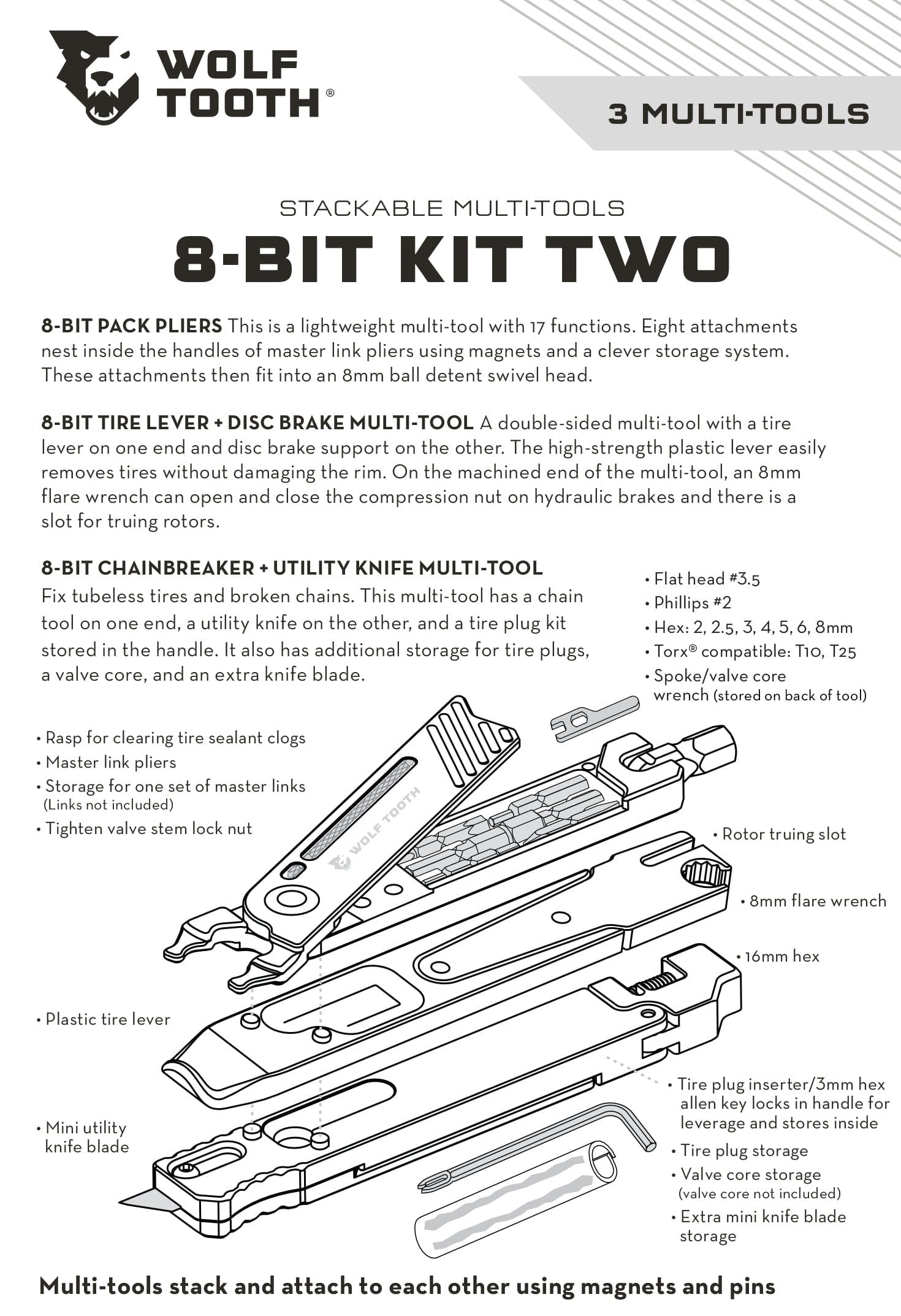 The 8-Bit System is a group of multi-tools designed to work together to solve most trailside fixes to keep you rolling to the trailhead or next town. They are lightweight, strong, versatile, and small enough to fit in a jersey pocket or riding tool wrap. The three neatly nest together using magnets and clever machining for compact storage.