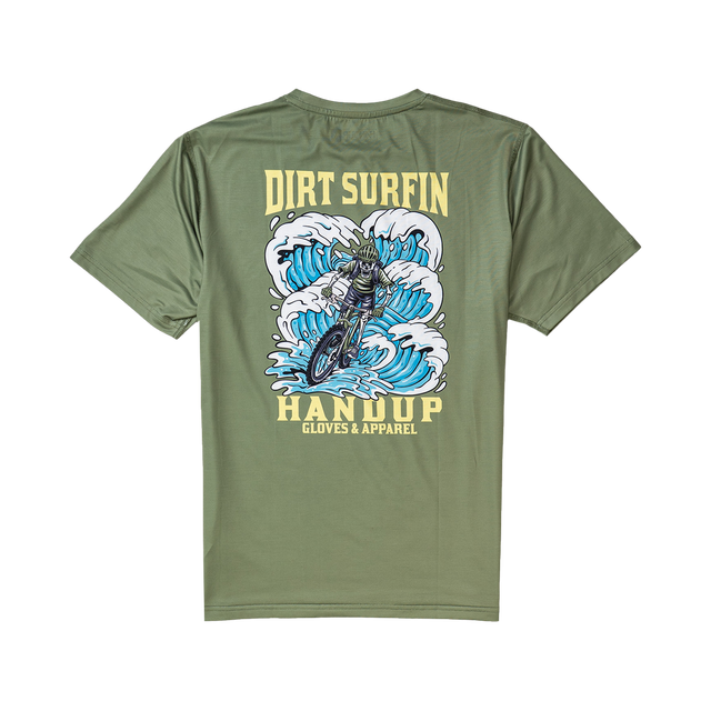 You're flying down the trail, tires floating on top of a bed of loam, just like a surf board on the water. That is what we were dreamin' of when we created the Dirt Surfin' ActiviTEE. It's an ode to those rare days when everything is hookin' up, and all you need to do is hang loose and dirt surf!