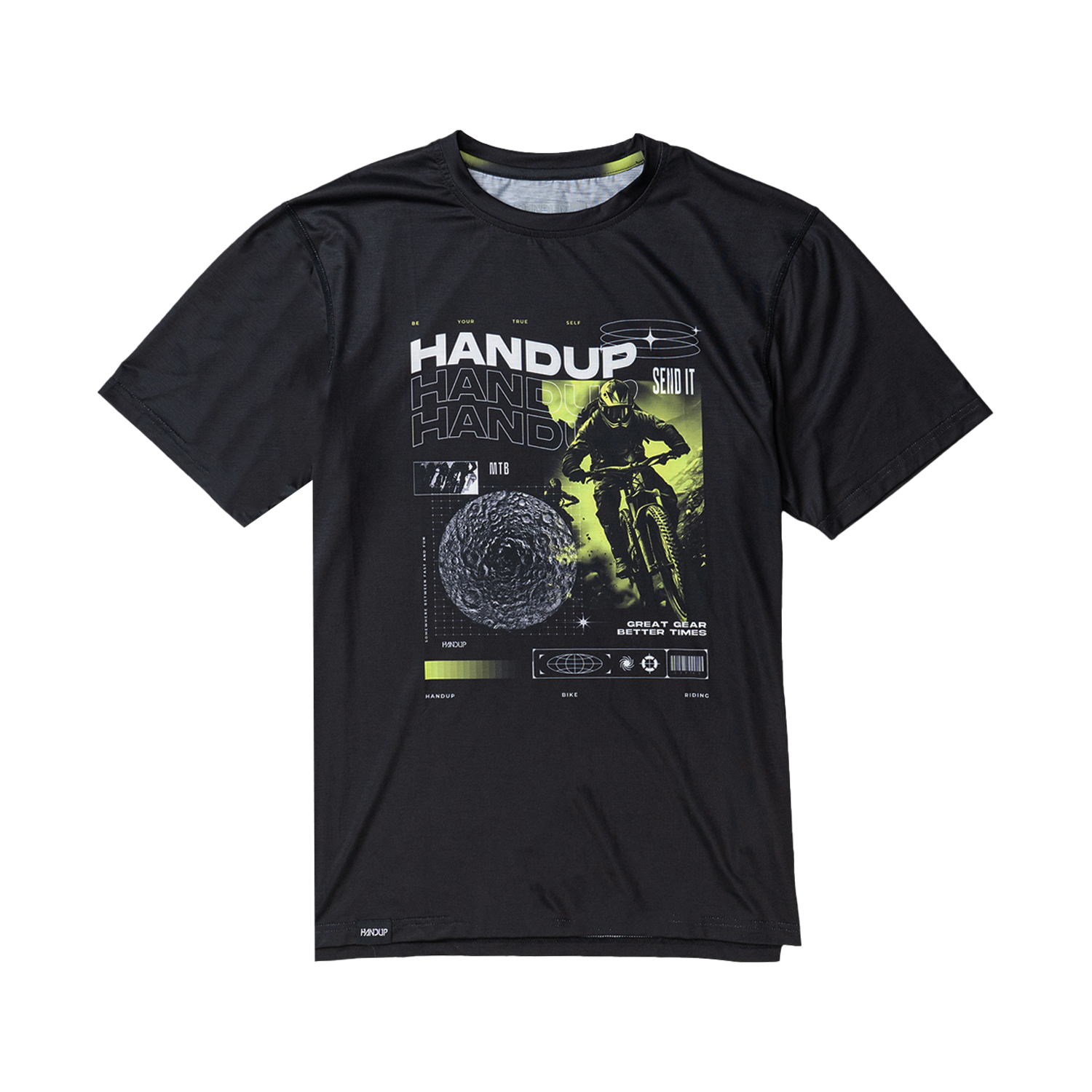 Futura means "about to be", which is what inspired us to design this post-streetwear ActiviTEE that showcases a wavy HANDUP logo and futuristic pieces that point to us "about to be" shreddin' on the bike. Welcome to the Future.