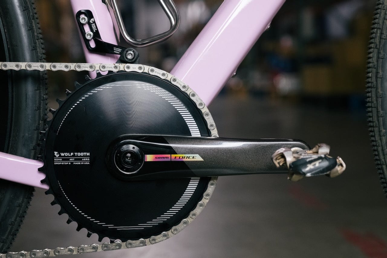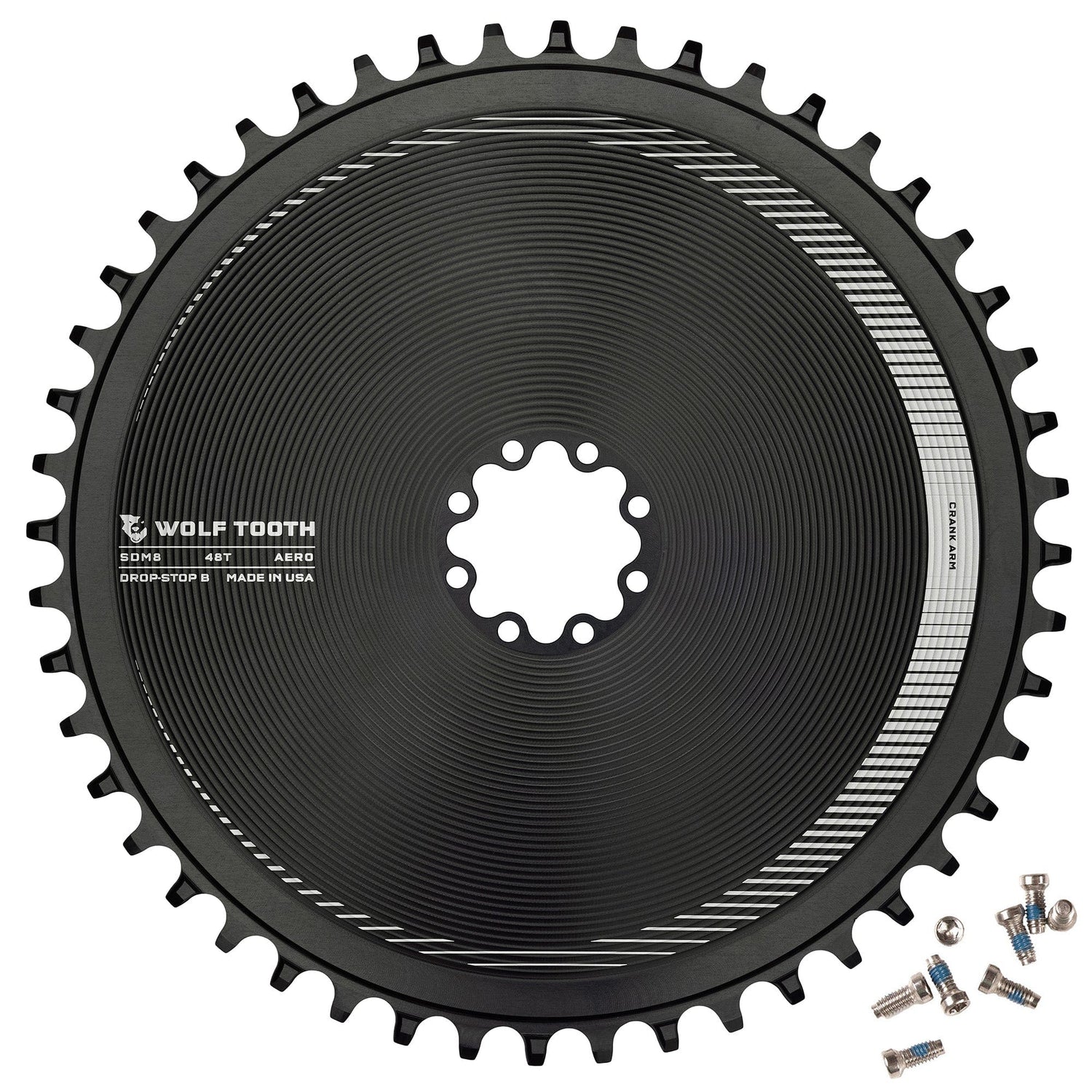 Designed for gravel and road racing, and for those looking to optimize each detail in pursuit of speed, Wolf Tooth Aero Chainrings are strong, lightweight, and profiled to mate perfectly with your crankset for a clean, integrated look. Taking advantage of 1x drivetrain systems and wider-range rear cassettes, Aero Chainrings are available in sizes 46T to 52T to provide similar overall range to standard 2x drivetrain configurations. They feature our patented Drop-Stop® design for the best wear life, chain retention, and mud clearance. Drop-Stop B is optimized for SRAM Eagle and Flattop chains.