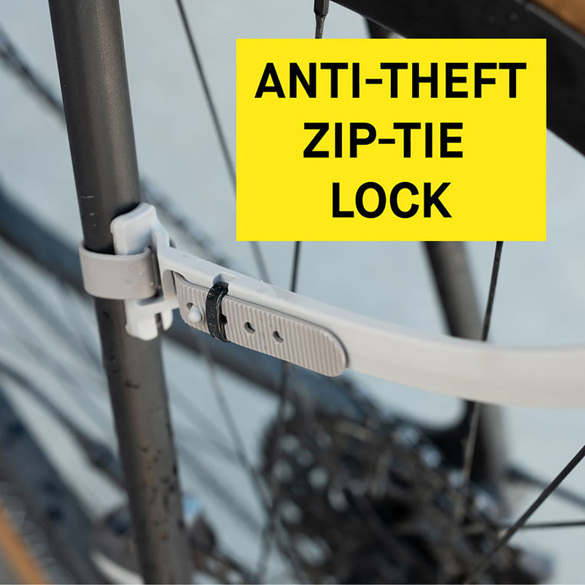 ANTI JAM, ANTI THEFT DESIGN: As sturdy as it is, the design of the Win-wing allows it to flex in case of an accident and it's constructed to not jam in case of large chunks of nature get stuck to your wheel. If you like to keep it attached to your bike permanently, the Win-Wing can be secured to your bike with a standard zip tie, through a designated slot, making it easier to resist for people with sticky fingers. If you experience that the mudguard is not stable, try to use the next hole.
