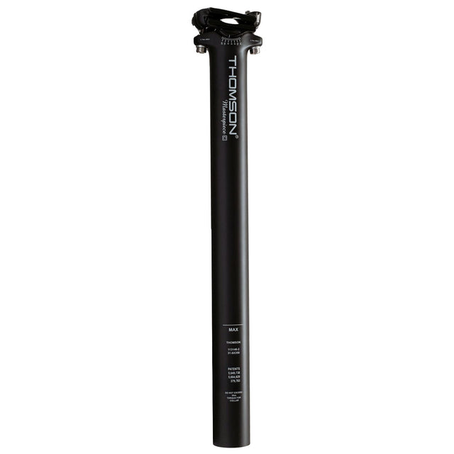 - Thomson has long held the title of the premium seatpost manufacturer. Now they bring their expertise to carbon seatposts: a true Masterpiece \n- Monocoque carbon construction \n- 41mm carbon rail clamping area, micro adjust and dual pivoting bolt head\n- Zero clamp offset, titanium hardware included. 179g (27.2x350mm)