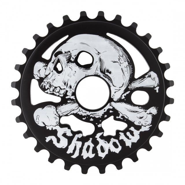 Basically the toughest looking BMX sprocket you can buy - skull and bones design with Shadow name below