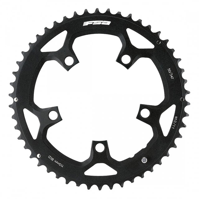 • FSA, 50T, 10/11sp., BCD: 110mm, 5 Bolts, Pro Road, Outer Chainring, For Double, Aluminum, Black, 371-0250F