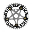 Black chainring with CNC machined silver teeth, anodized spider and ED gold bolts