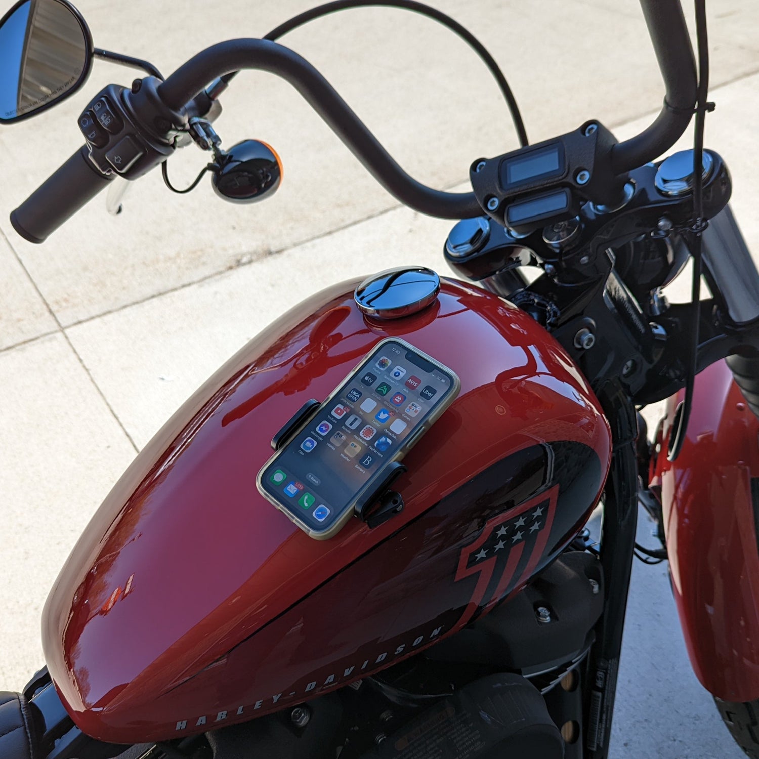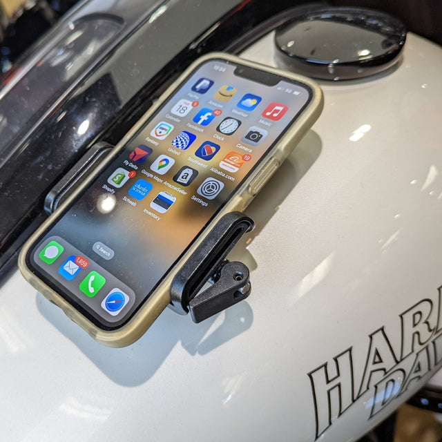 The Clinger won’t let go, even if you do. Quality built to keep your phone close at hand. Mounts to steel surfaces. Perfect for motorcycle gas tanks, golf carts posts, toolboxes, and your steel drum band. Fits all phones and most with or without cases. The Clinger works best without excess phone case baggage like deep phone holders. Super-strong clamp attaches to metal surface with rare earth magnets for instant mounting. Holds strong but is simple to take off and on. Universal - Fits phones 3.40" in width and smaller. Don’t leave home without The Klinger, it wouldn’t without you!