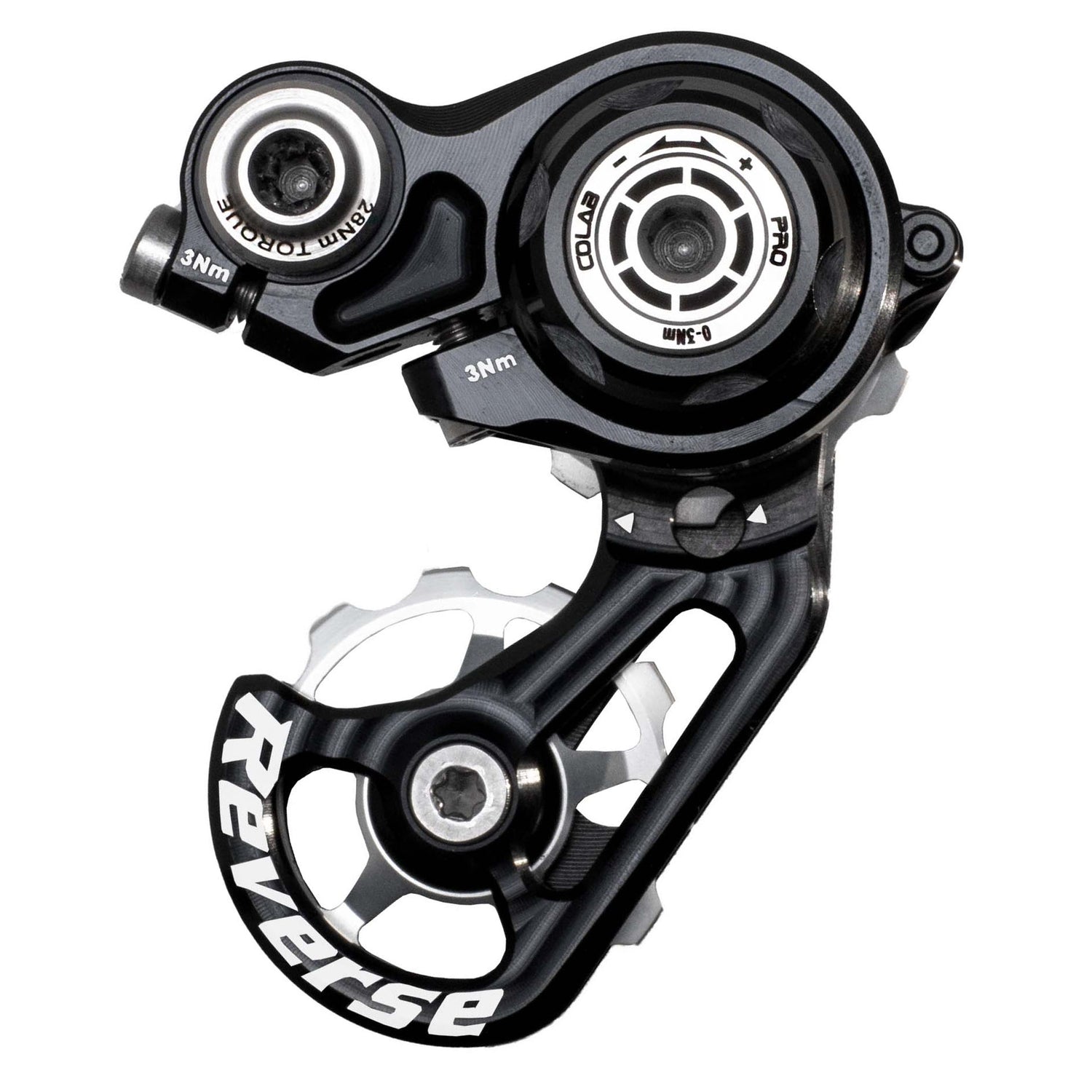 - Replaces rear derailleur with chain tensioner for a simple, secure drivetrain\n- Offering a user adjustable clutch system, the Colab Pro allows the rider to fine tune the level of tension on the chain, to give the quietest ride no matter how hard the terrain gets. A simple turn of the central allen bolt offers a huge range of adjustment to suit every bike, suspension and riding style - eliminating chain slap\n- 15mm of adjustability for the chainline by loosening one bolt, helping riders achieve perfect chain alignment without the removal of the tensioner\n- Adjustable limit stopper as well as a pinch bolt on the mounting bracket and higher spring tension provide more chain retention and also maintains position when the rear wheel is removed\n- CNC Aluminum pulleys for maximum durability\n- Compatible with 9/10/11 speed chains, 13-17 tooth cogs\n- Aluminum construction, made in Germany