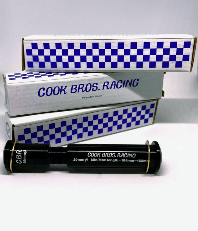 Discover unparalleled versatility and performance with the Cook Bros Racing Universal Axle size, engineered to redefine your cycling experience. This axle is the ultimate solution for any dropout it encounters, seamlessly fitting all 20mm through-axle hubs ranging from 103mm to 163mm in width. Its universal compatibility ensures you'll never need another axle. Design in the U.S.A. with precision from 7075-T6 aluminum and fortified with copper hardware, the Cook Bros Racing Universal Axle combines lightweight durability with exceptional strength.