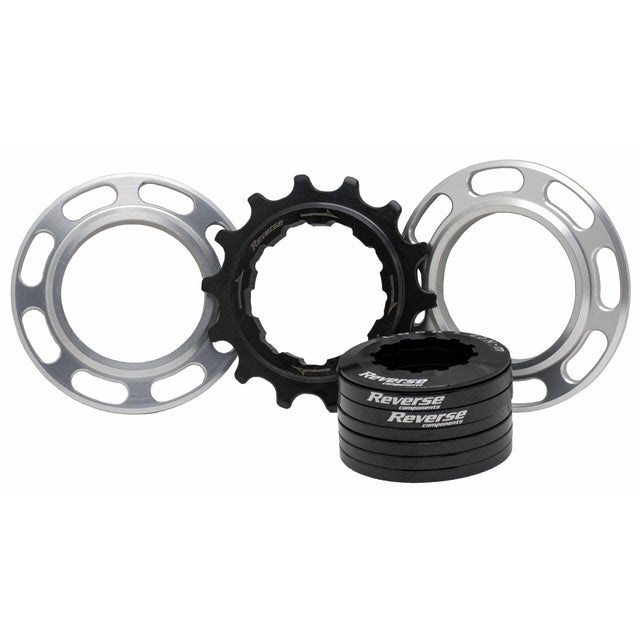 - Convert any normal HG freehub wheel into a Singlespeed drive with a purpose designed kit for gravity full suspension bikes\n- A refined tooth design engages the chain more securely than traditional single speed cogs\n- CNC aluminum sprocket guides act like a chain guide for the rear cog, sandwiching the chain in place\n- Sprocket guides feature a machined mud-shedding pattern which allows dirt to clear out no matter the riding condition \n- Includes cog, alloy lockring, spacer and two sprocket guides
