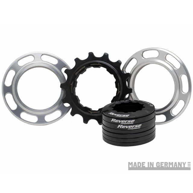 - Convert any normal HG freehub wheel into a Singlespeed drive with a purpose designed kit for gravity full suspension bikes\n- A refined tooth design engages the chain more securely than traditional single speed cogs\n- CNC aluminum sprocket guides act like a chain guide for the rear cog, sandwiching the chain in place\n- Sprocket guides feature a machined mud-shedding pattern which allows dirt to clear out no matter the riding condition \n- Includes cog, alloy lockring, spacer and two sprocket guides