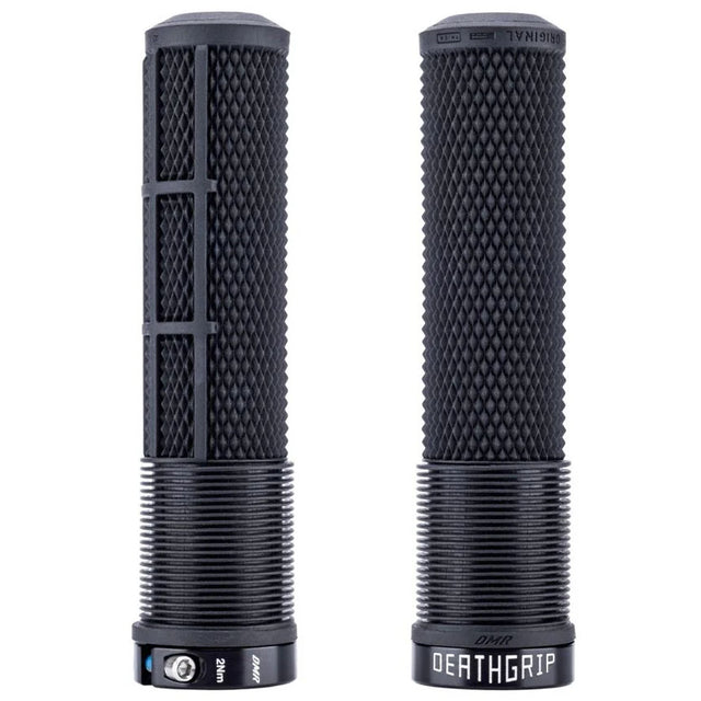 - The Deathgrip2 features a soft mushroom section for comfort in the thumb and forefinger area, preventing blisters in a soft-tissue zone\n- The grip pattern features diamond knurl for grip in all conditions and all terrains with a waffle layout underside that holds your fingers in the perfect position for grip and control\n- Collar lockring is now slimmer, more refined, and more integrated \n- Slimmer flanges with a new relief design and fresh DMR logo\n- Made from a standard krayton 20a(25a on the gum version) compound for extra comfort and control