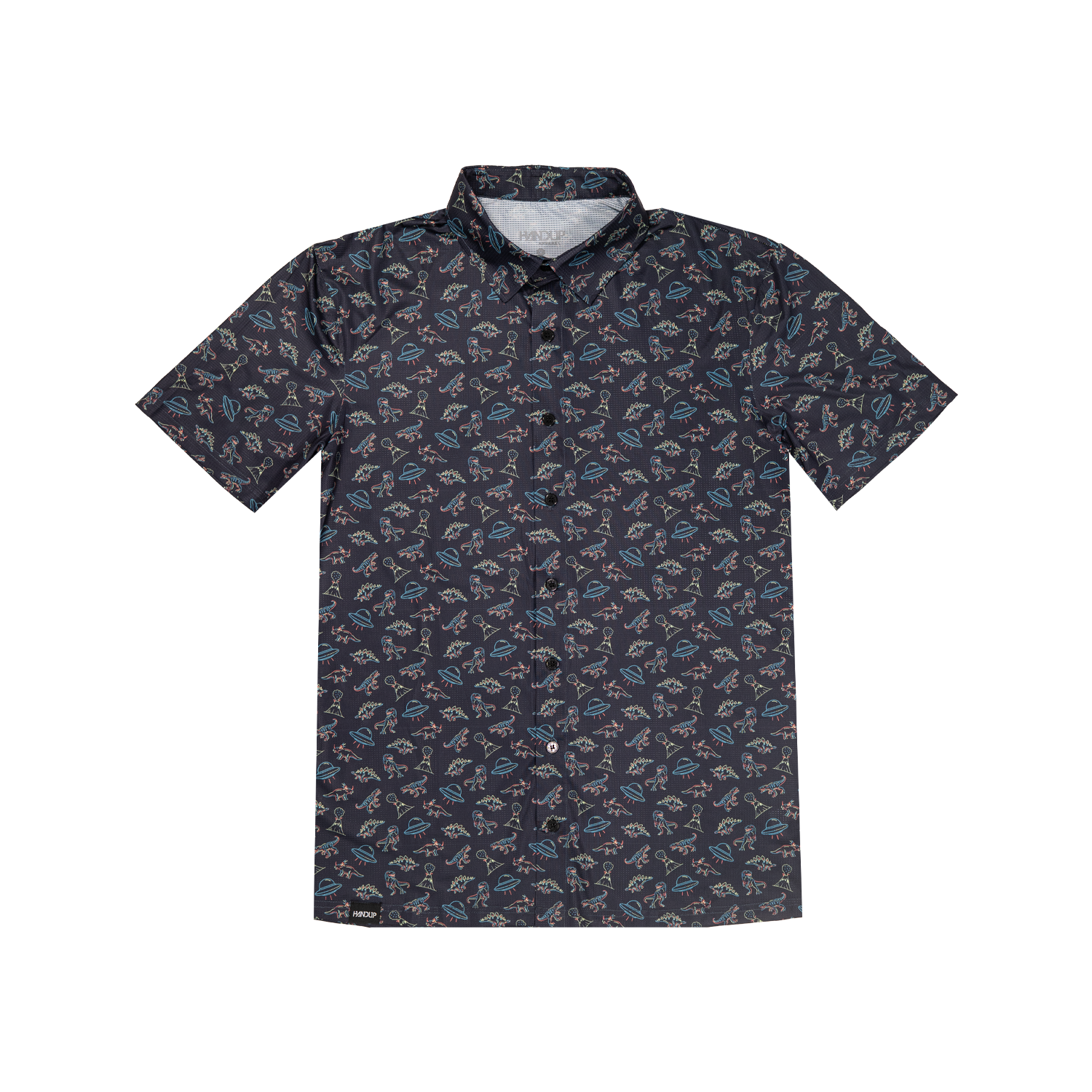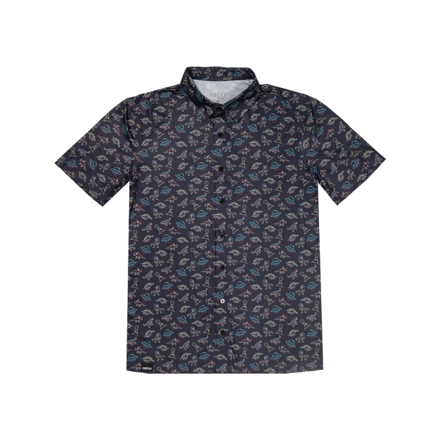 FlexGRID Button Up - UFO Dinos - X SMALL is backordered and will ship as soon as it is back in stock.