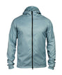 A hooded, hybrid cut, technical windbreaker with two hidden pockets, dual directional zipper, and combination of protective and stretchy fabrics for adaptive fit and protection.