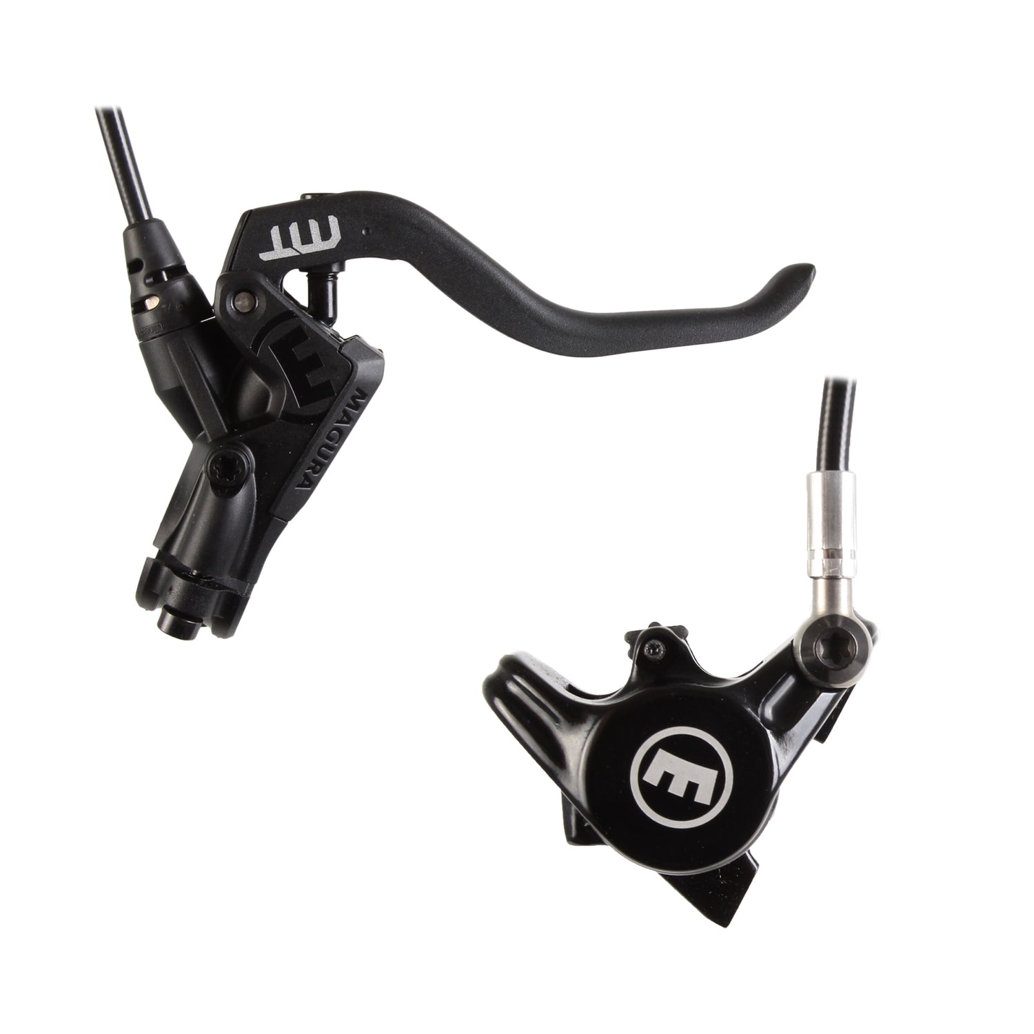 - Carbotecture body is a proprietary carbon weave that is nearly twice as strong as carbon laminates, aluminum or magnesium\n- Carbotecture radial design master-cylinder/lever with 2-finger alloy lever blade and clamp with adjustable reach, flip/flop design, and EBT or Easy Bleed Technology port on reservoir \n- Double Arch forged 2 piston monoblock caliper design features anti-heat, anti-drag, anti-squeal, and magnetiX brake pad system for easy pad replacement \n- Full hydraulic Magura Royal Blood mineral oil system with a 5-year leakproof warranty\n- Includes flip/flop front or rear lever, 2000mm pre-bled tubing kit, MC/lever, alloy hardware, tubing shortening bits, and manual\n- *Rotor and adapters sold separately