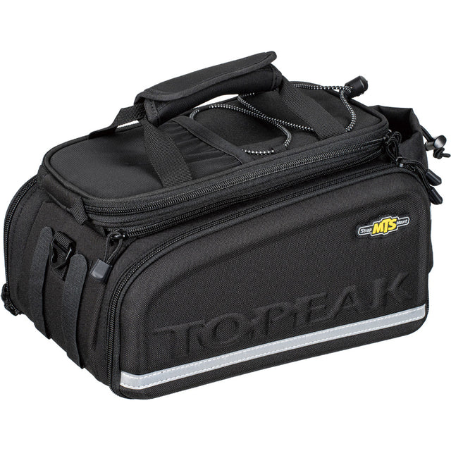 - Extra-large capacity trunk bag with divided main compartment, multi-stage expanding top \n- Panels on both sides expand out into panniers\n- Insulating rigid molded EVA foam side panels\n- Choose Velcro straps or MTX 2.0 QuickTrack compatible model (for use with Topeak MTX 2.0 racks - see EX Beam, Explorer, Super Tourist racks) \n- 420 denier nylon fabric for rigidity and water repellency \n- Includes carrying handle, shoulder strap, 3M reflective strip, taillight clip, bungees, water bottle holder\n- This item contains Per- and Polyfluoroalkyl Substances (PFAS), therefore is barred for sale into the State of California under the California Safer Clothes and Textiles Act which takes effect January 1, 2025