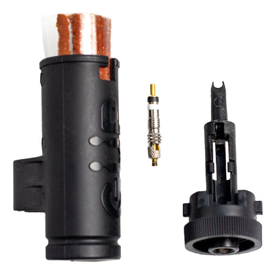 - A lightweight, saddle-mounted flat repair tool designed for riders who want speed, simplicity, and zero pocket or pack clutter\n- Pairs perfectly with GUP canisters to take care of large to small punctures\n- Claw plunger allows bacon strips to be folder instead of threaded through, speeding up repairs. Presta valve core tool included\n- Tool clips on the saddle rail, ready for easy deployment\n- Kit includes 5x thick rubber strips and a spare presta valve core