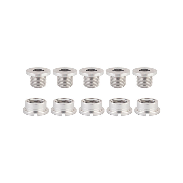 For use with single chainring cranksets. Inside height measures 4mm when tightened 7mm total height. Set of 5 bolts and nuts. Available in multiple colors