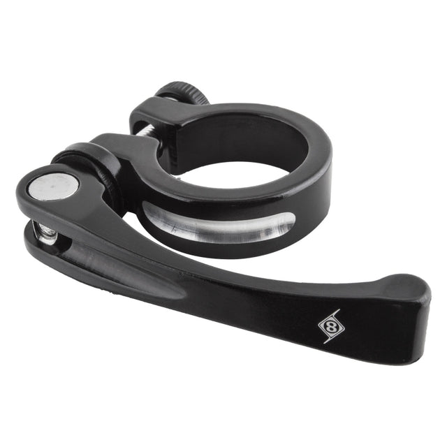 Seat clamp with extra leverage design. Black anodized and machined. Seat clamp with extra long quick release lever for added clamping force