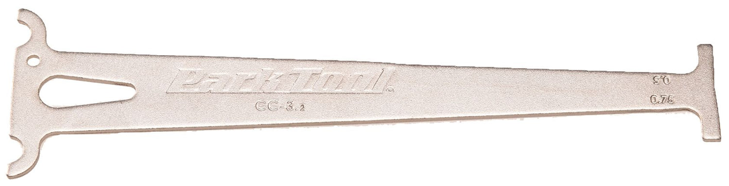 Park Tool CC-3.2 Chain Wear Indicator. A worn bicycle chain can cause poor shifting and in time can even cause excessive wear to the derailleur and rear cogs causing a much more expensive problem. Thats why bike component manufacturers recommend chain replacement at regular wear intervals. The Park Tool CC-3.2 is a go/no-go gauge designed to accurately indicate when a chain reaches 0.5% and 0.75% wear (or "stretch") the points at which most chain manufacturers suggest replacement. The CC-3.2 is long accurate and features permanent measurement markings. The CC-3.2 works on most derailleur chains* from 5 to 12-speed.5-to-10-speed chains: replace chain at or just before 0.75%