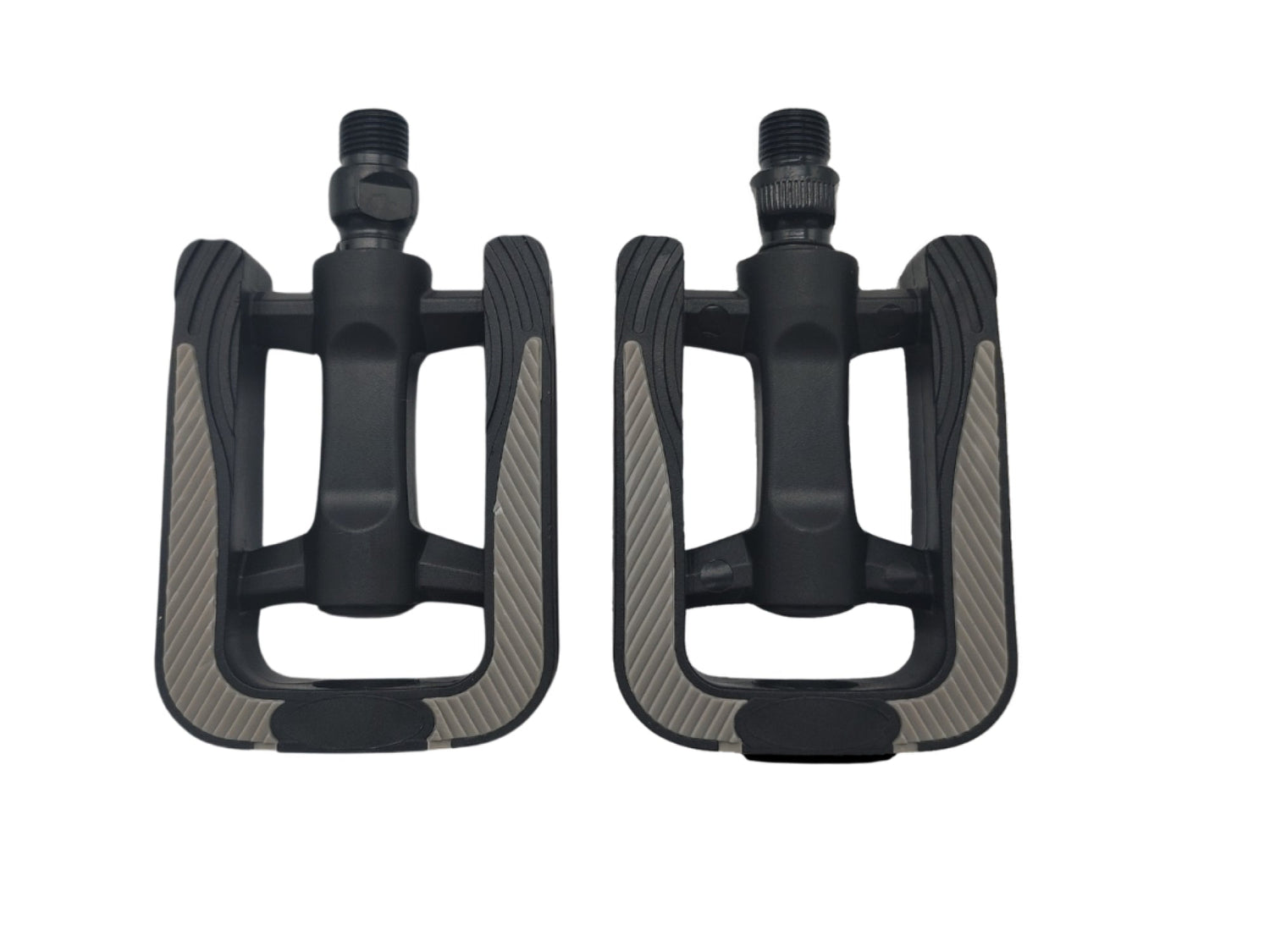 This pair of resin 9/16" pedals features orange safety reflector stripes on both sides of each pedal to increase visibility, and a non-slip rubber insert.