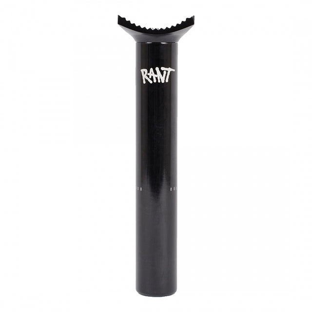 Black pivotal seat post with laser etched Rant logo for a clean and simple look