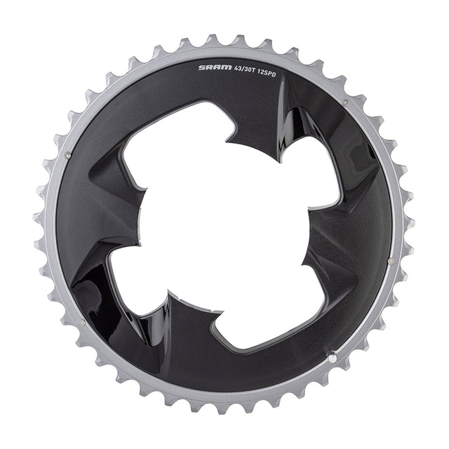 SRAM Force Wide 2x12-Speed Outer Chainring - 43t 94 BCD 4-Bolt Polar Grey For use with 30t Inner. 4-bolt chainring for Force AXS 2x12 cranksets.X-Range gearing technology gives you more range and a smoother gear progression so you’re always in the right gear