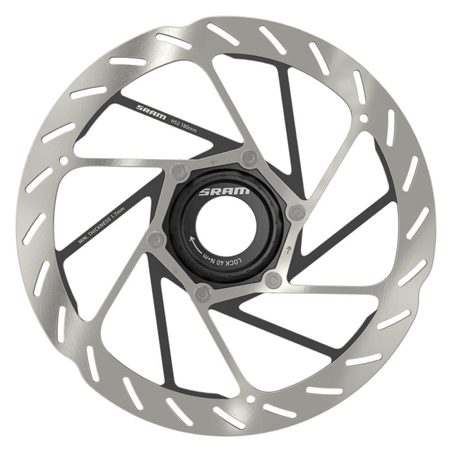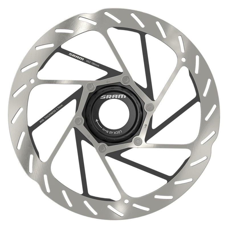 SRAM HS2 Disc Brake Rotor - 180mm Center Lock Rounded Silver/Black. The SRAM HS2 Rotor is a mountain bike specific rotor designed to improve brake performance while reducing noise and increasing heat dissipation. It features a brake track pattern for increased pad traction and recessed spokes with thermal dissipating paint the HS2 is a more powerful quieter rotor with best-in-class heat management.Thicker 2mm disc brake rotor features spokes coated in thermal dissipating paint for superior heat management