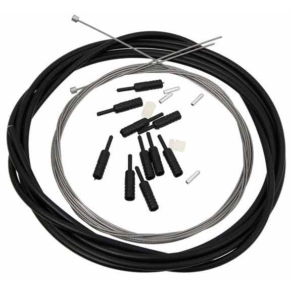 - Cable and housing set with special ferrules and end caps\n- Anti-compression housing reinforced with Kevlar and super slick inner sleeve\n- Pre-stretched stainless steel inner cable with slick outer profile\n- Rubber donut frame protectors included\n- SRAM and Shimano compatible