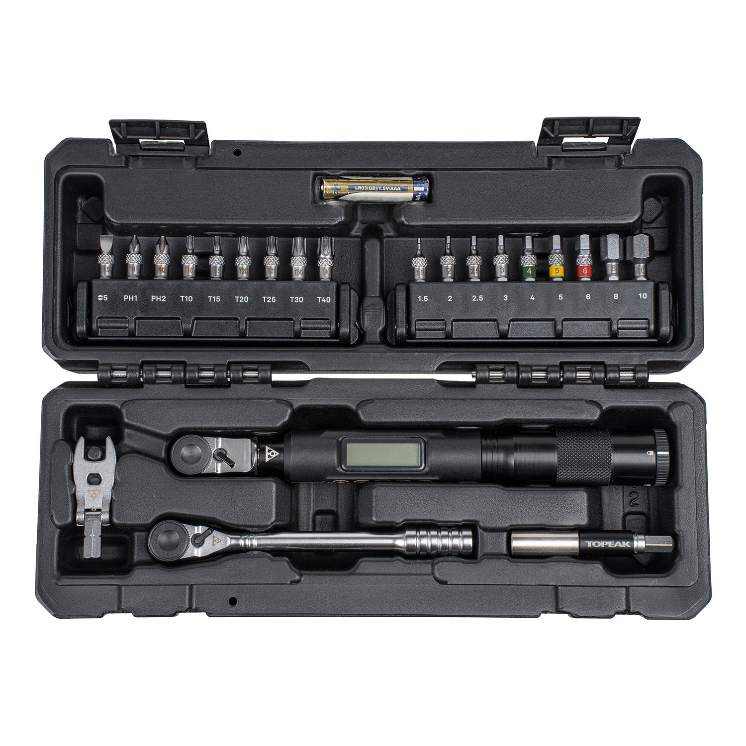 - A digital torque wrench with adjustable range from 1-20Nm that features an audible/vibration alert when torque setting is reached\n- Bits are knurled to make insertion and removal easier\n- Includes Ratchet Rocket HD for non-Torq usage\n- Also includes 8mm crows foot and extension bar\n- See www.topeak.com/us/en for list of included parts
