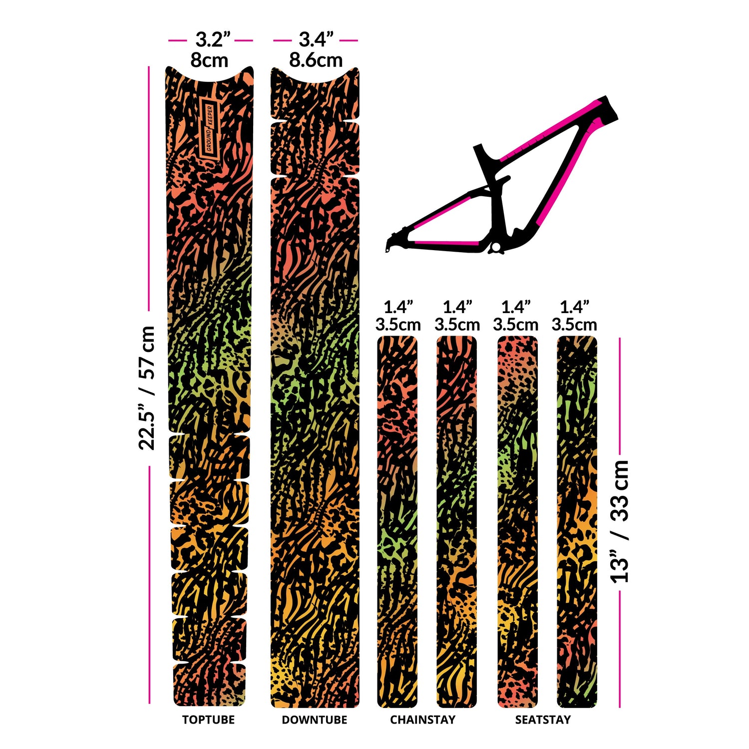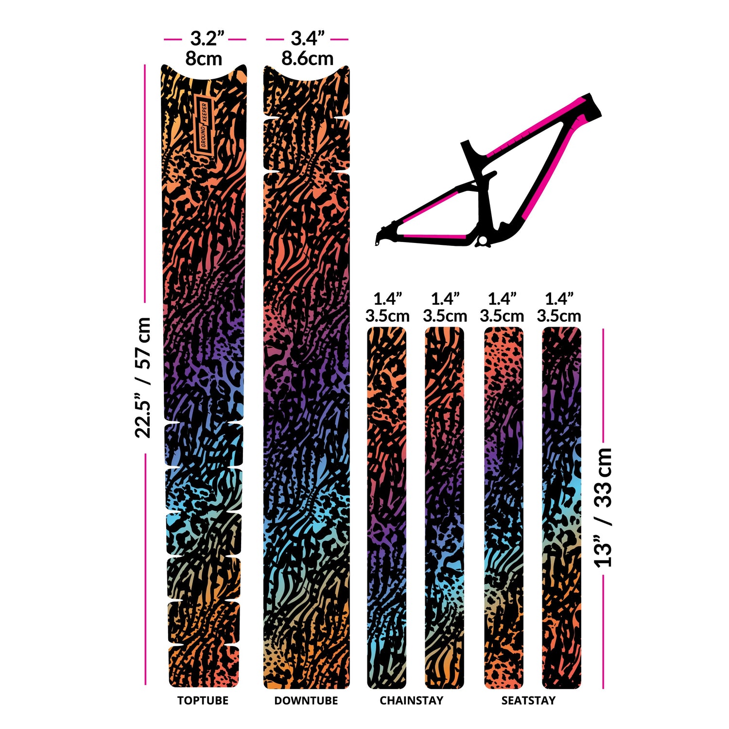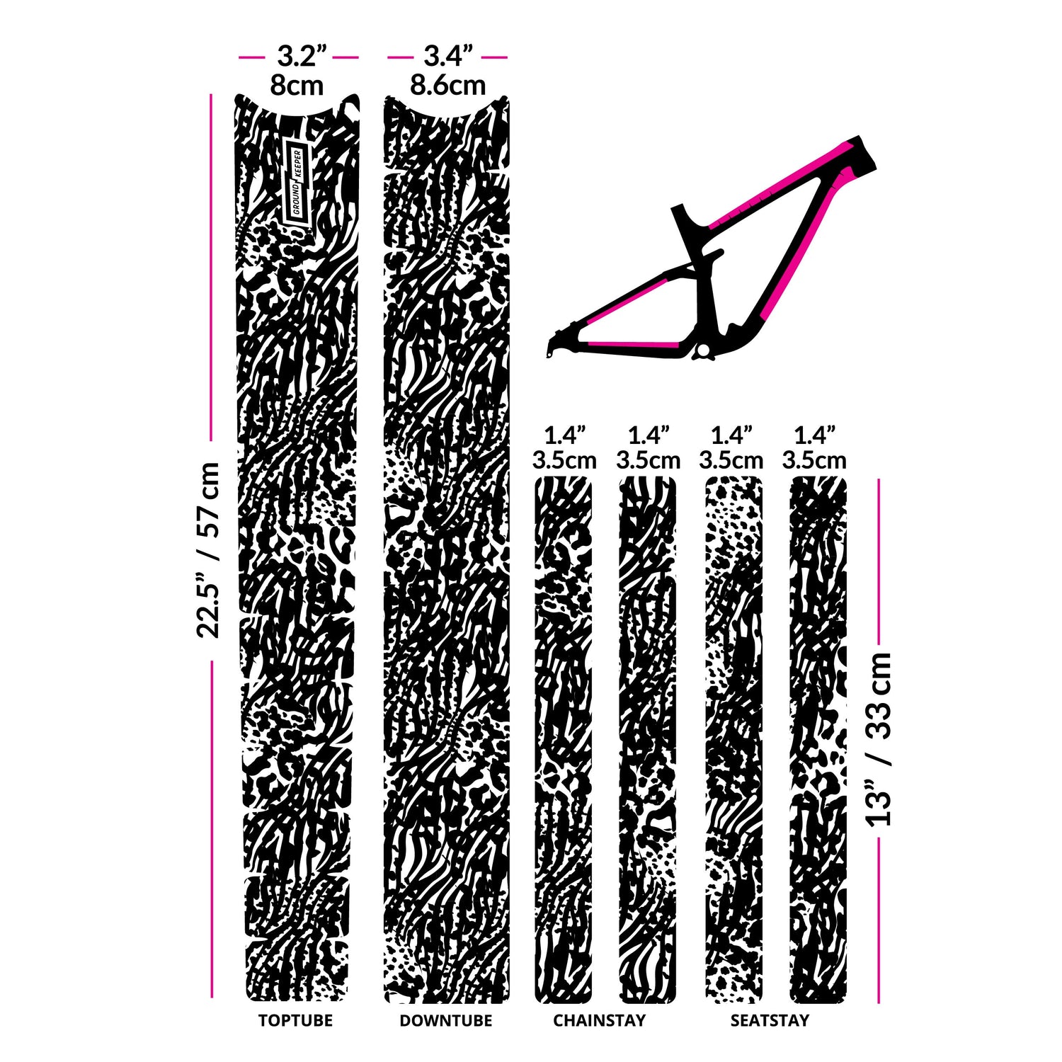 Universal kit designed to fit all bikes and sizes. Comes with 6 easy-to-trim pieces for toptube, downtube, chainstays, and seatstays. Designed to fit XL frames, and is easy to trim down to the desired size.