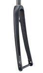- Straight steerer with integrated crown race\n- Fits tires up to 30c wide\n- Flat mount disc, 160mm max rotor\n- Full monocoque carbon construction\n- 400g including 12mm thru-axle