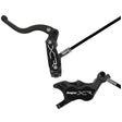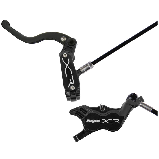 - XCR lever lever is a lightweight design, featuring carbon lever blade and titanium hardware\n- Lever features reach adjustment and hinge clamp for easy installation\n- One piece 4-piston caliper is CNC machined from a solid billet of 2014 T6 aircraft spec aluminum alloy\n- Includes: lever assembly, pre-bled (black) hose with stainless fittings, (74mm) caliper\n- *Rotors and adapters sold separately